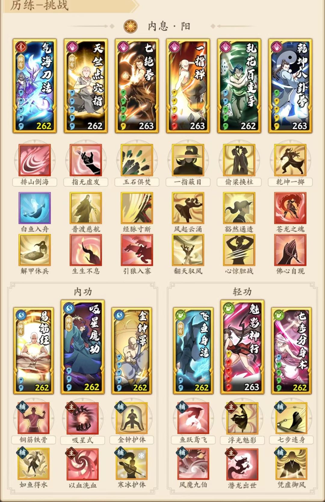 驭风又绑定了乱花,乱花不在六号位吃不到逍遥心法的逍遥状态,就必须吃引狼的逍遥,引狼入寨就需要绑定在乱花前面。一指禅的配招没法变双出手挂风起云涌。唯一能考虑的变招是把双出手给乾坤乾坤挂风起云涌。吸内的路不太好走了,武学特性导致吸内架子非常固定,就这么一个框你往里塞东西好多东西都塞不进去,必须要取舍了。我也想后置普渡慈航,后置苍龙,但是真的放不进去。唯一我感觉能换位置的是佛心我和苍龙,但换了位置不知道为啥就是效果不好。乱花我也想弄到三四号位去变五岳剑防debuff,但是弄不到那里。指如疾风可以换豁然贯通,哪个为主换豁然贯通效果也挺好,我比较贪。如果五号位上的豁然贯通可以考虑把轻功辅运鱼如得水换一个。反正现在吸内怎么配招都怪怪的,突出一个不合理。而且气海刀强度太高了,没法不带,又占了个格子。先出一轮配招试一试好不好用。目前心愿是乾坤八卦拳和魅影神行,稀有挂的葵花(准备挂一个招式影下生花),绝学准备挂大陌刀法(绝学基本以开招式为目的)