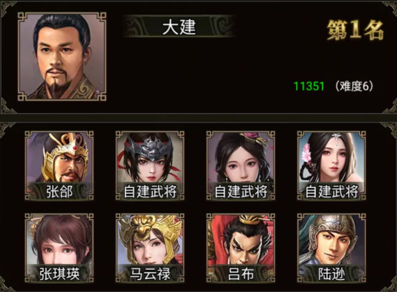大建 军团配置的武将有张郃、张琪瑛、马云禄、吕布、陆逊、孙尚香、陈到和三位自建武将。