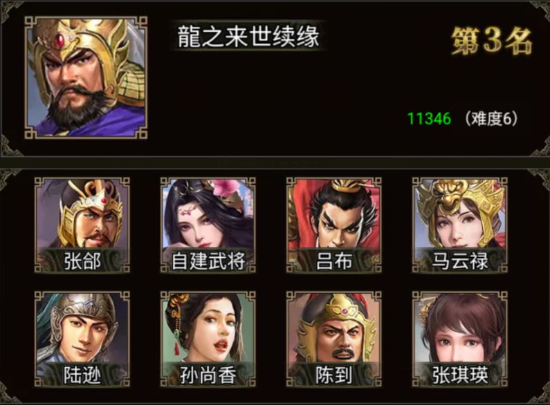 龍之来世续缘军团配置的武将有张郃、吕布、马云禄、陆逊、孙尚香、陈到、张琪瑛和三位自建武将。