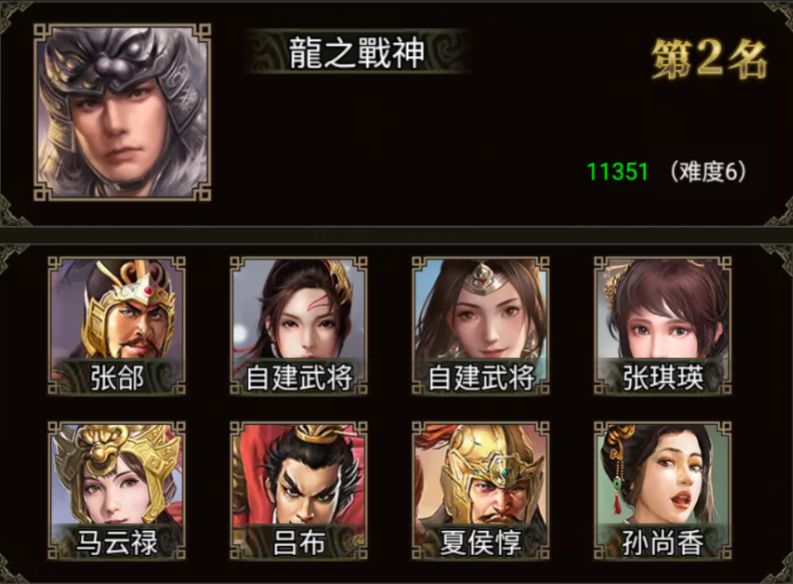 龍之戰神 军团配置的武将有张郃、张琪瑛、马云禄、吕布、夏侯惇、孙尚香、陈到和三位自建武将。