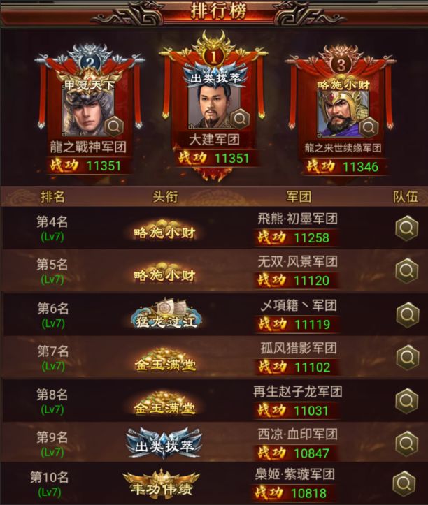 其中,“武将名 x%”代表该历史武将在本次战役的前十玩家中使用率为x%。