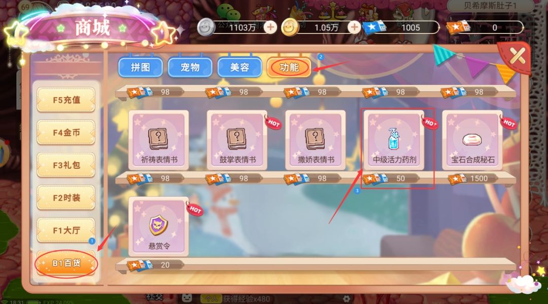 在商城里,左边选择B1百货,在功能栏,在倒数第三个中级活力药剂,注意这个中级药剂一天只能用两个哈~