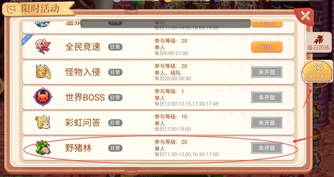 每天会有一个限时活动——野猪林,完成这个任务有一定概率获得活力,这就要看大家的运气了哈