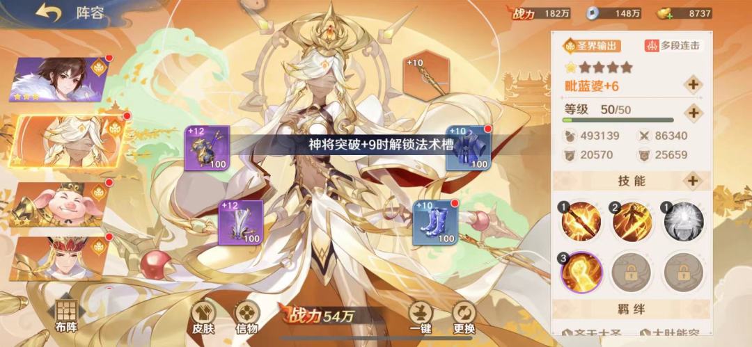 这套组合能够稳定增加主力输出神剑在第一回合的爆发伤害,大概率能造成敌方减员,为己方创造优势,这个还是十分推荐的。适合神将:孙悟空、白骨夫人、二郎神等主力输出;