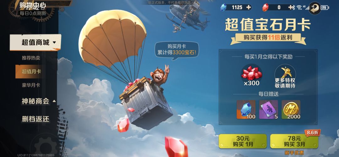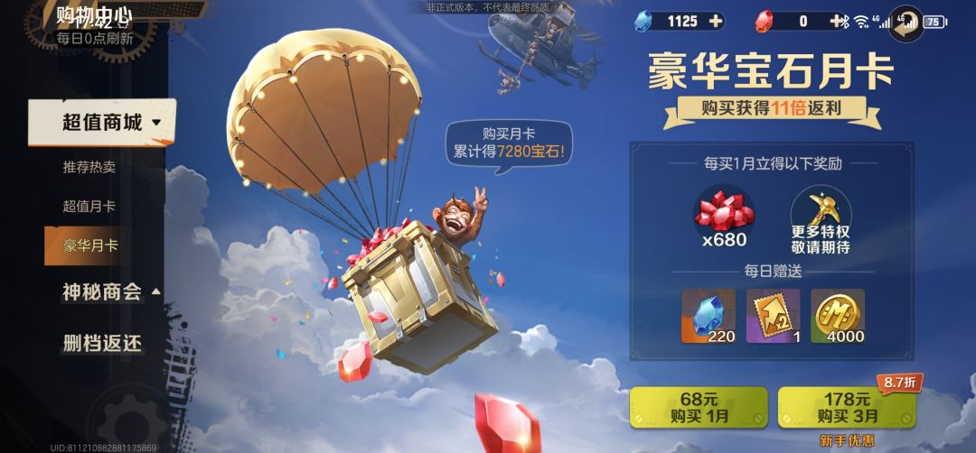 月卡已经是所有游戏都有的活动了,不仅可以获得更多道具,11倍返利,还有一些游戏特权。这两种月卡,我比较推荐豪华月卡,178买3个月还是非常实惠的,月卡党可以无脑购买。