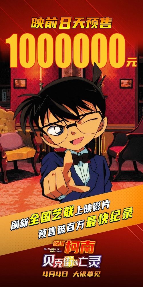 根据第三方专业版数据显示,《名侦探柯南:贝克街的亡灵》映前8天预售总票房现已突破100万,这打破了全国艺联上映影片预售破百万最快纪录,该片将于4月4日在在全国艺术院线上映,4月11日起在全国影院上映。