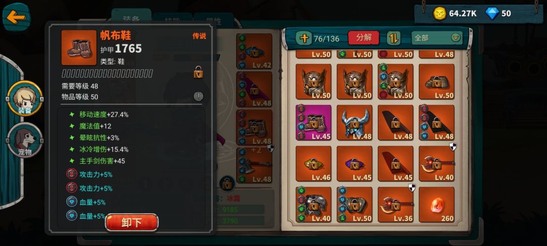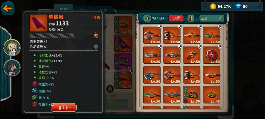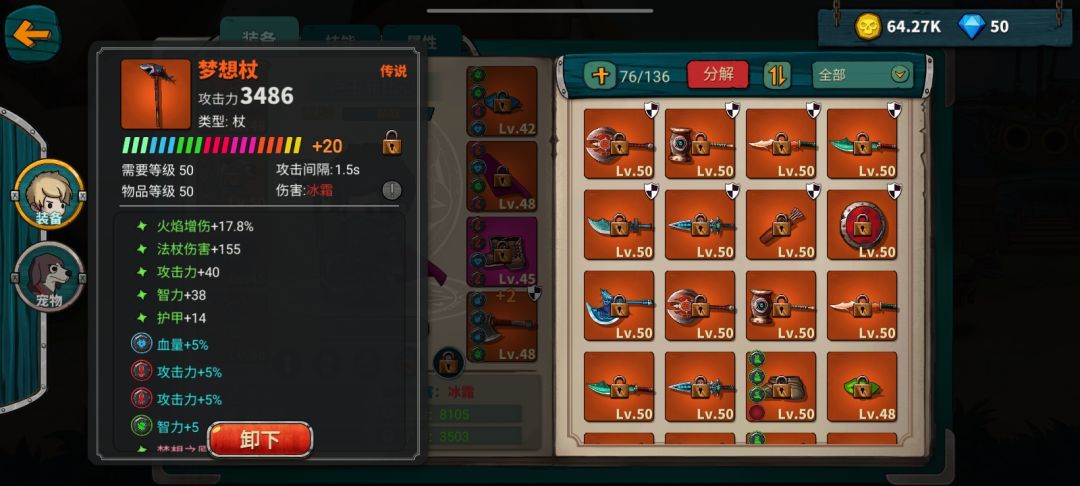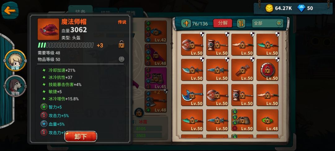 cd满了再追求伤害,所以要留得整备就是一个冰杖,一个50级任意副手装备,50智的必须的举着,28+移速鞋子也留着,20+-CD留着,主要是这三个打材料洗属性。