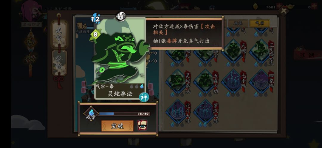 拿牌的时候毒牌只拿灵蛇拳法(如下),有复制就复制,最少四张,越多伤害就越高嘿嘿