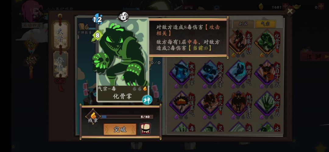 前期伤害不够的时候,可以拿一张化骨掌配合叠毒的装备,伤害很高的,后面得删掉,不然没法永动鸡