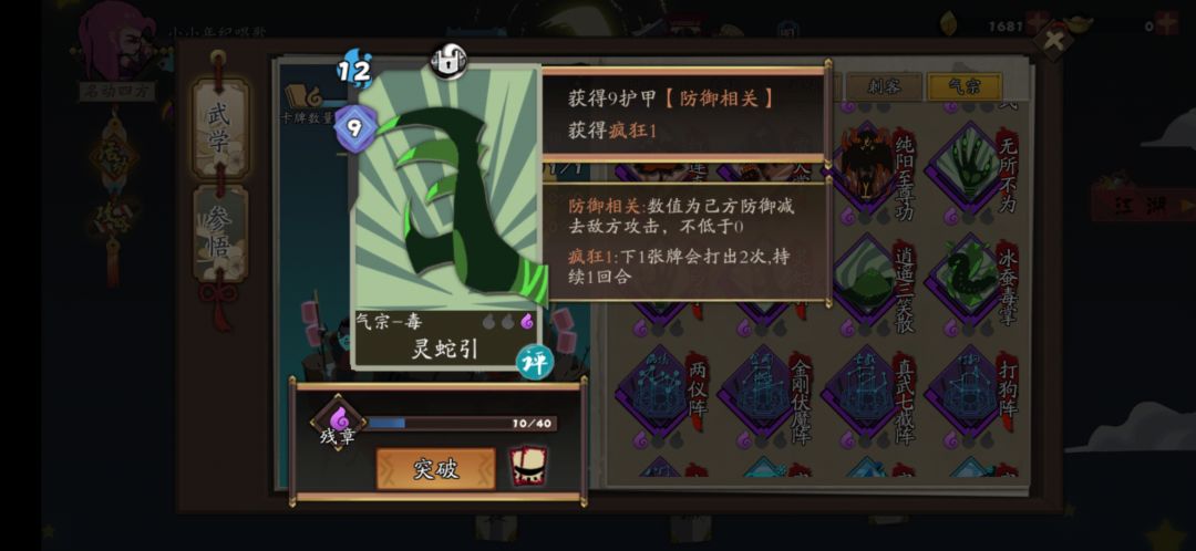 当后期卡组成型了,可以拿金刚伏魔阵,太强了,第二张灵蛇拳法必触发,刷刷刷就秒了