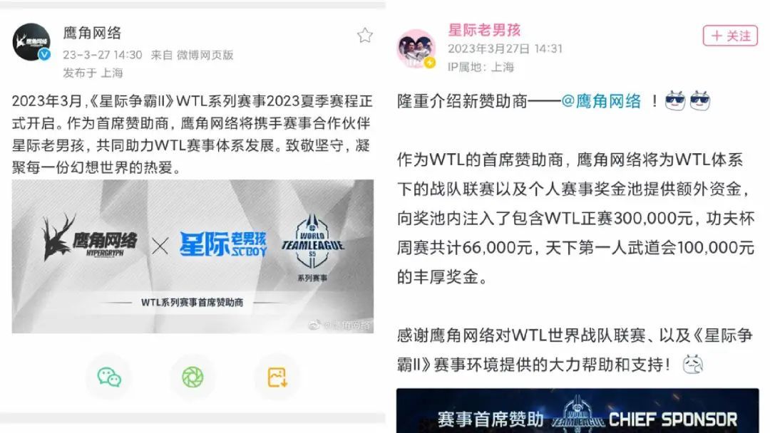 今日,鹰角网络在微博官宣成为《星际争霸2》WTL(World Team League)系列赛事首席赞助商,赛事主办方星际老男孩也在B站发布动态表示感谢。WTL自2019年开始举办,每届比赛都备受《星际争霸2》玩家关注,被部分媒体称为“全球《星际争霸2》赛事体系中最重要的比赛”。