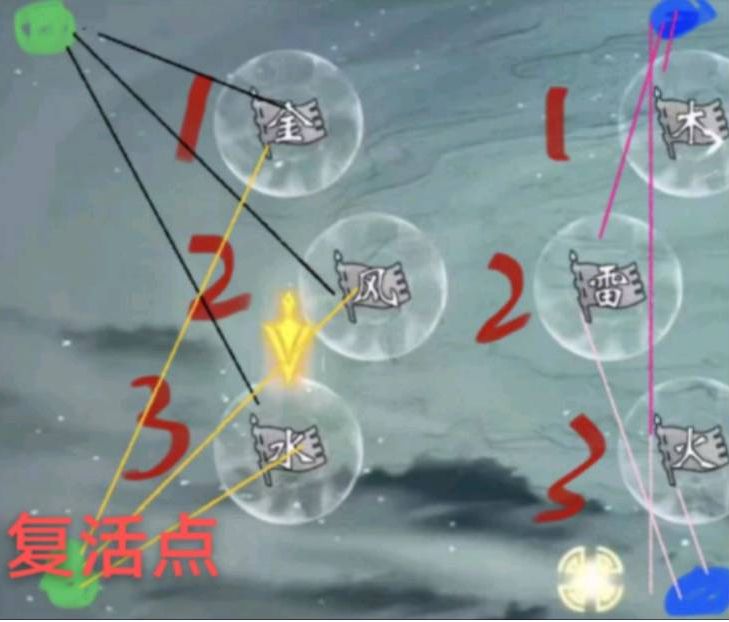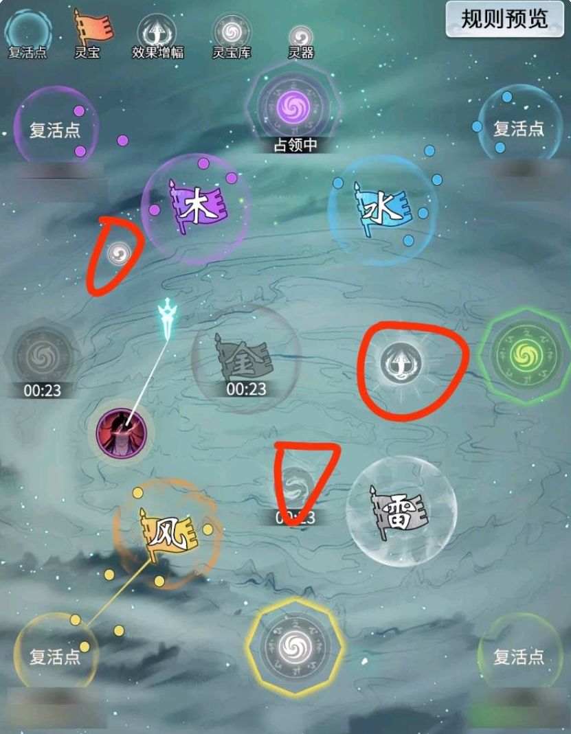 ●以左下是己方复活点为例,开局之时,一、二两组观察敌方战力,分头抢占风、雷仙器,三组抢占水仙器;后续一组一仙器,按刷新时间有序占据。若敌对宗门实力较弱,一组高战可考虑在路上击退对方。