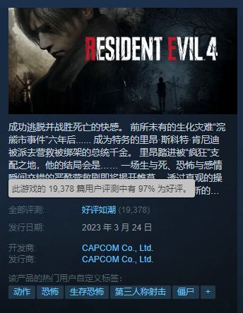《生化危机4:重制版》自发售以来好评不断,口碑持续走高,截止发稿前,在Steam商店页面,游戏“好评如潮”,好评率已涨至97%!