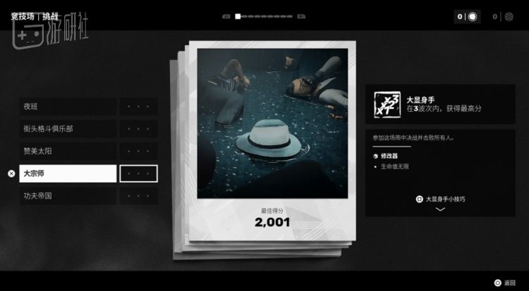 在第一关的“大宗师”挑战中,主角身穿黑长衫,头戴白帽的造型很明显致敬了经典电影《一代宗师》中梁朝伟在雨夜中打斗的场景,而这关的挑战目标也非常简单粗暴——在3轮攻击波次内,尽可能拿到高分。