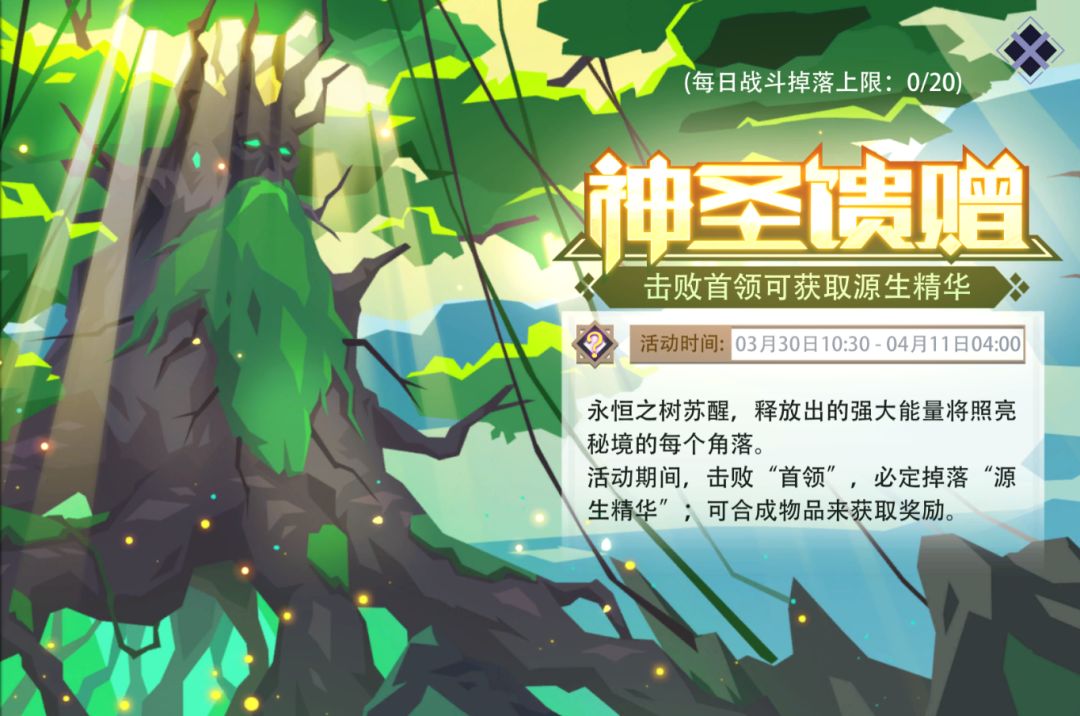 活动内容:活动期间,在(冒险模式/冒险试炼场/梦魇模式)下击败每一层的“首领”, 均可获得随机数量的“源生精华”;每日上限为20个。所得的“源生精华”将直接放入玩家的背包内,可用来合成“星辰之耀”;打开后能获得魂石、魔晶等物品。