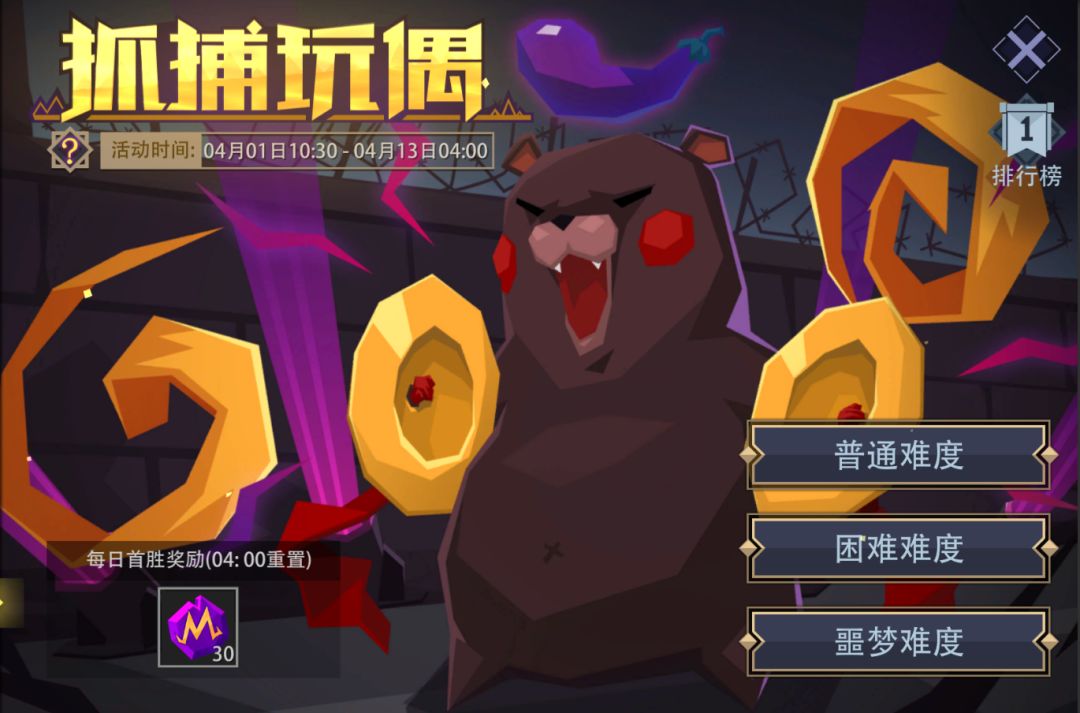 活动内容:节日来临,玩偶失去控制,四处乱窜,需要您合理放置陷阱将其捕获。游戏分为普通、困难、噩梦三种难度,无论哪种难度下进行游戏,只要每日首次胜利即可获得奖励;次日凌晨04:00刷新。“抓捕成功“才有机会进入排行榜,按照难度和步数进行排名。