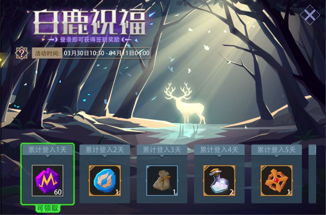 活动内容:白鹿赐福,好礼相送。活动期间,每日登录游戏即可领取签到奖励。