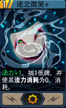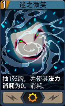 ※迷之微笑:特殊水系魔法卡,1费,抽1张牌,并使其法力消耗为0。消耗。(升级后额外法力+1)