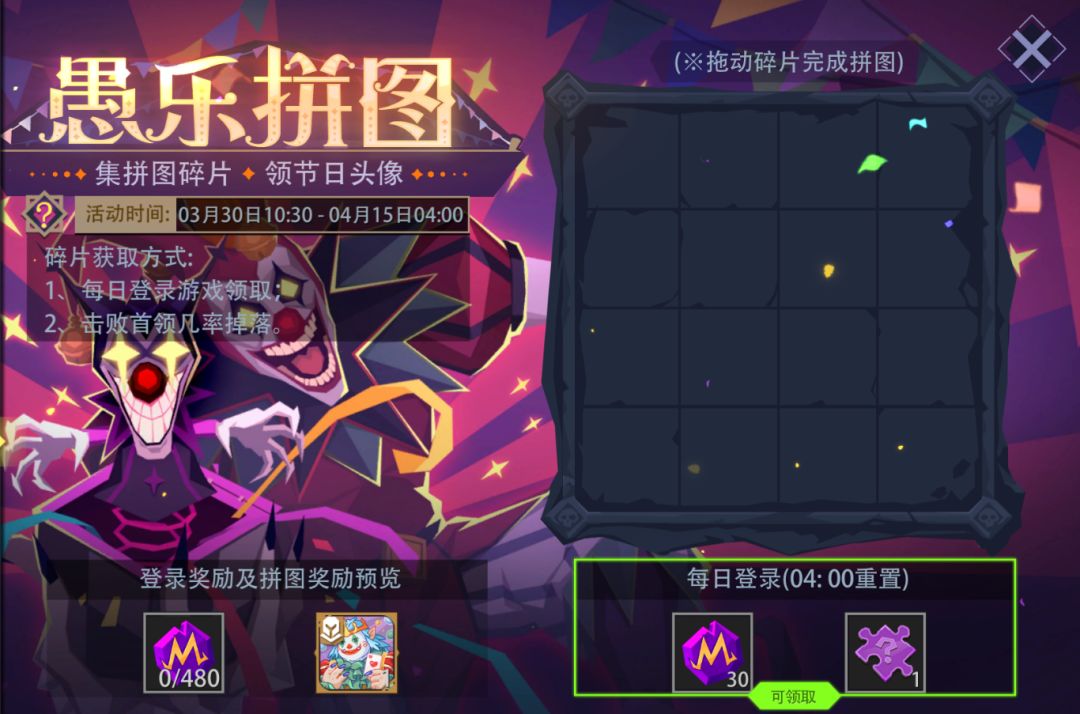 活动内容:愚乐派对,雪人王子化妆来袭。活动期间,每日登录游戏可领取魔晶及随机拼图碎片奖励。另外,在(冒险模式/冒险试炼场/梦魇模式)下击败首领也有几率掉落拼图碎片。集齐所有拼图碎片并拼凑完整,还可以获得“限定愚人节头像” [小丑王子塔塔]。