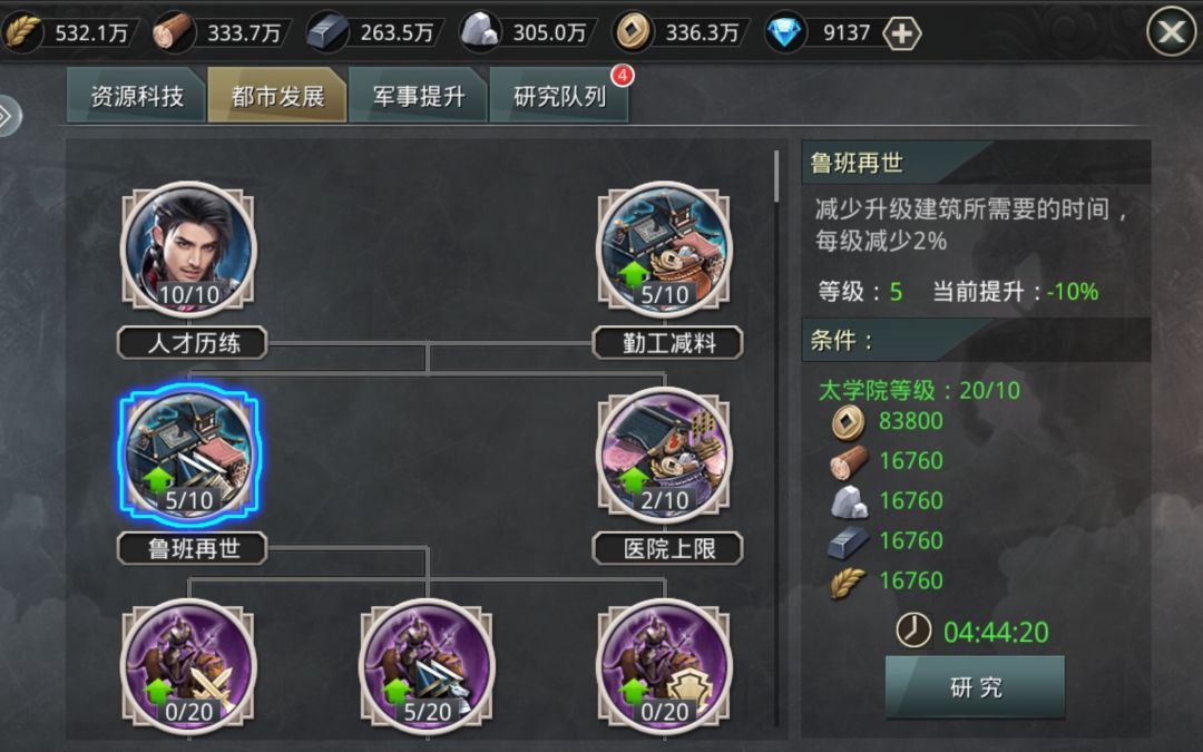 学院用来升科技,科技这一块我是这样升的,作为参考,暴击率是我主要想开出来的,谁能拒绝暴击那种快感与数据呢😍把前置科技点出来,每样5级,然后主升暴击,有条件的中间穿插着都市内里面的鲁班来升,那个减时间和所需要资源,挺合适。
