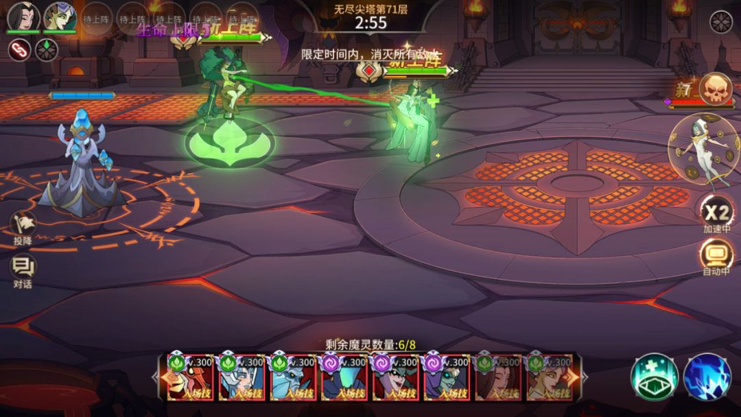 最后部分魔灵拥有上场技能效果,如果使用得当可以逆转战局,建议可以选择手动上场魔灵进行战斗,以便保证魔灵的上场时机、位置,从而得到将魔灵上场技能效果最大化。