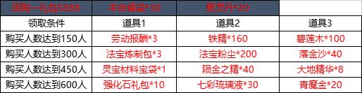 【活动名称】限时团购【活动时间】3月29日维护后~4月5日5点【活动简介】活动期间内,道友们可购买活动界面的团购商品。当购买团购商品的人数达到一定数量时,购买过该商品的道友们可以额外领取相应奖励。