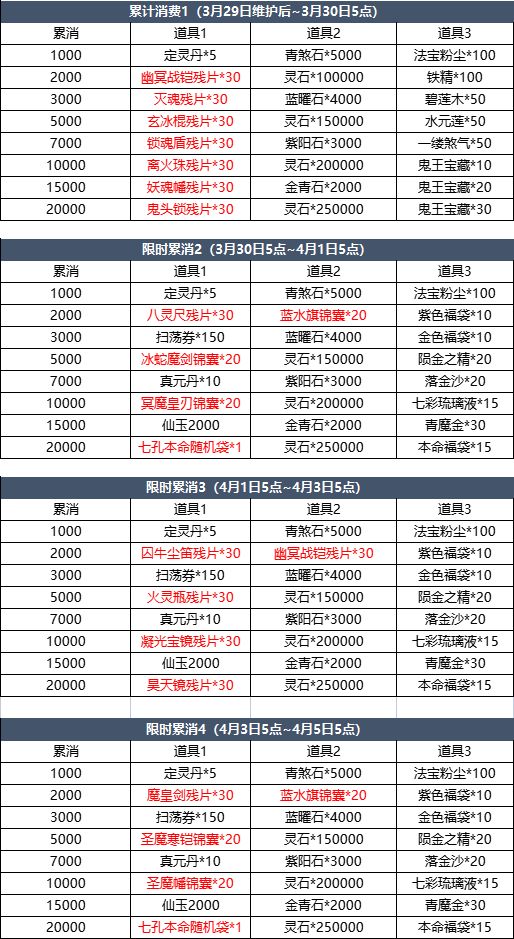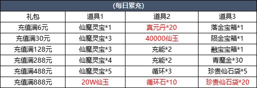 四、每日累充【活动名称】每日累充【活动时间】3月29日维护后~4月5日5点【活动简介】活动期间,每日累计充值达到指定金额即可领取相应好礼。