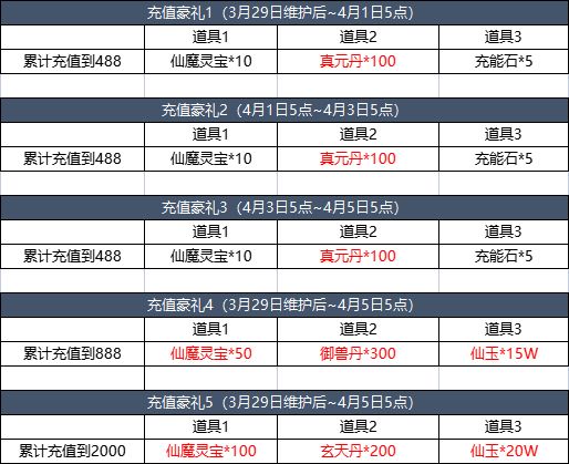 五、充值豪礼【活动名称】充值豪礼【活动时间】3月29日维护后~4月5日5点【活动简介】活动期间累计充值达到指定金额即可领取惊喜礼包!