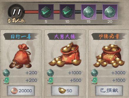 每日捐献可获取从200-500-1000的威望,起初帮会人数较少,不做任务是无法领取所有奖励的