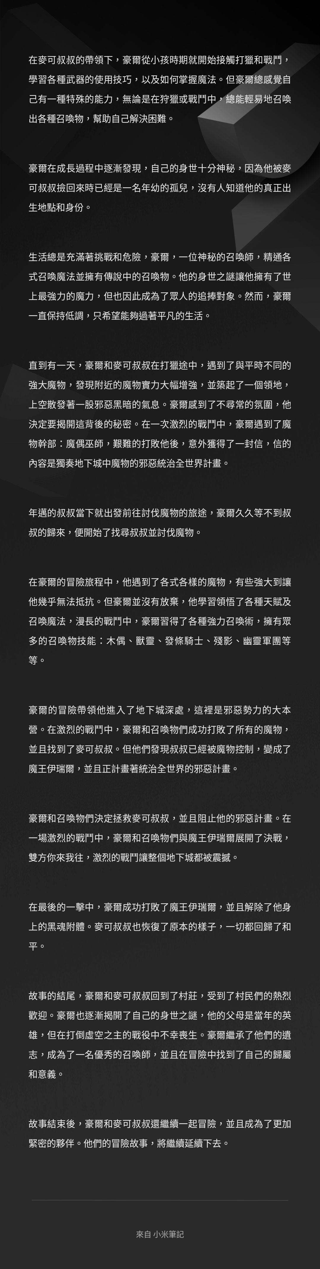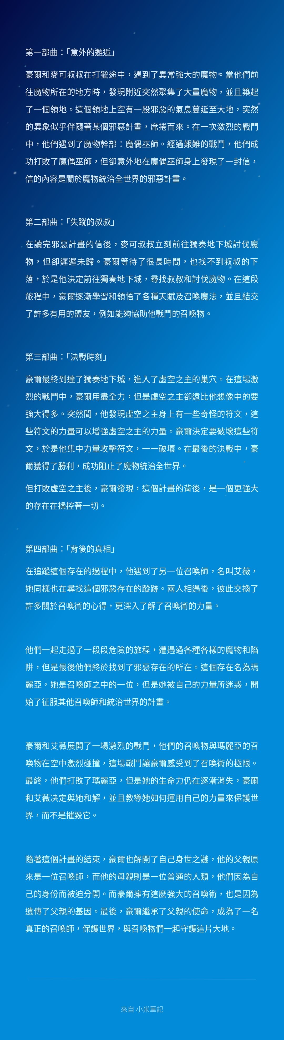 召喚師是一個神秘而強大的職業,他們擁有著召喚各種強大的生物和魔法的能力,可以幫助他們戰勝各種強大的敵人。豪爾就是一個出色的召喚師,他在冒險的過程中學到了很多東西,也遇到了很多挑戰和困難。但是,他從未放棄,一直在努力著,最終成功地保護了世界的和平和繁榮。