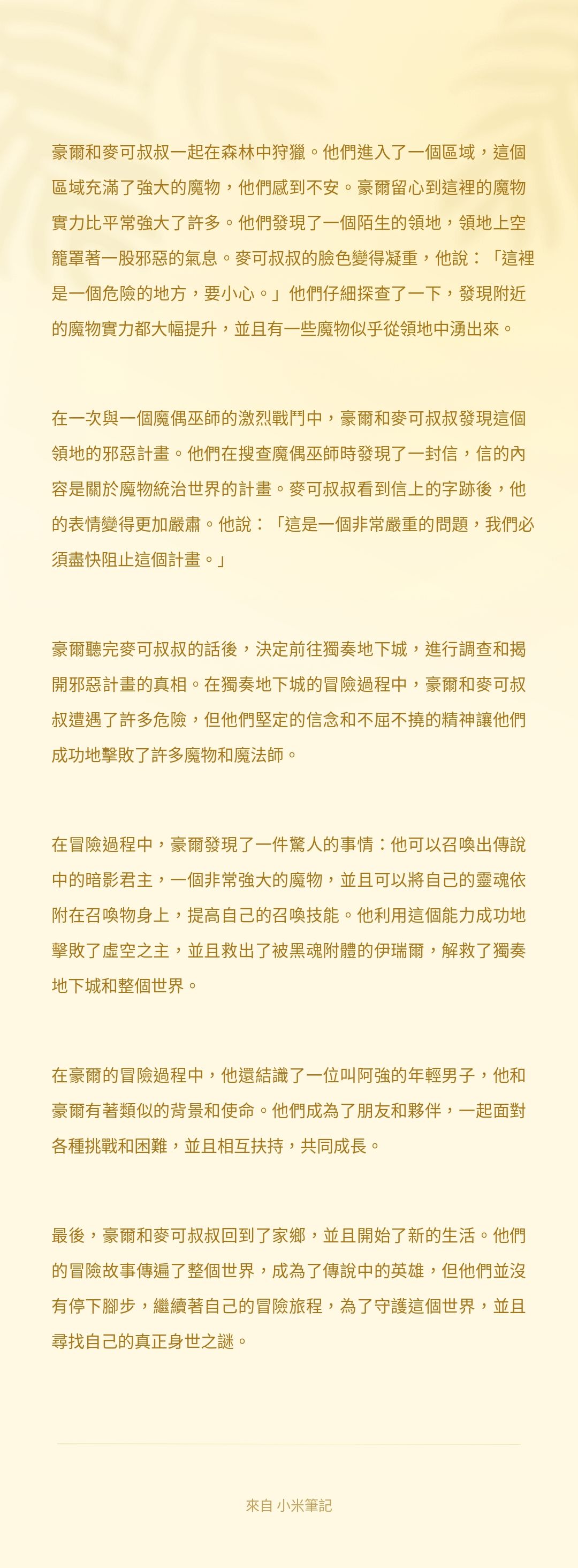 豪爾的冒險並沒有停止,他繼續踏上了新的旅程,帶著他的夥伴們,去探索更遠的未知領域。