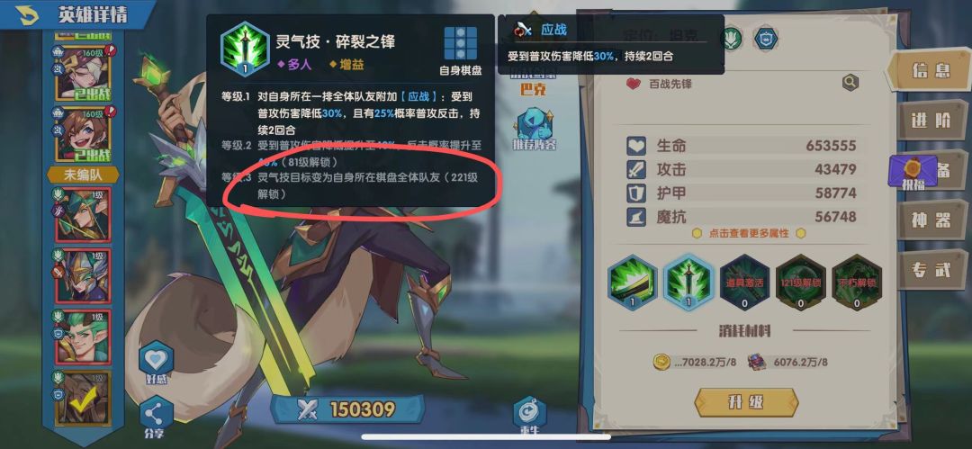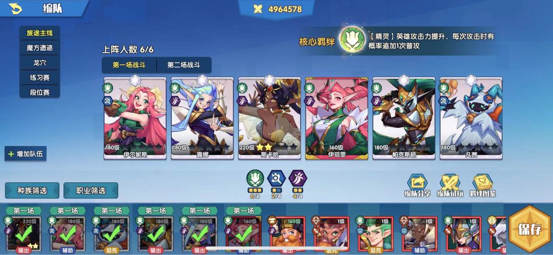 这里我选择的是奥兰多,当然,如果没有的话任意一个暗裔都可以,我只是说奥兰多是比较适合精灵的。这样就正好凑齐了6精灵1暗裔4游侠的羁绊。而精灵的羁绊是整个队伍的输出关键点以及输出方式,那就是:追加普攻!