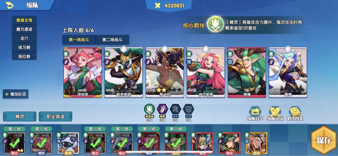 阵容的话在你弄完我最开始讲的初始阵容后,就一直可以用到其他角色抽到红,而蓝卡里面用的最久的就是贾德了,毕竟这个蓝卡算是所有蓝卡里面最肉的一个了。抽到露娜并且培养到金了以后,就可以换掉补位的暗裔来组成6精灵4游侠的阵容了(由于我没有新手号,所以卡的品质上大家自行脑补就好了