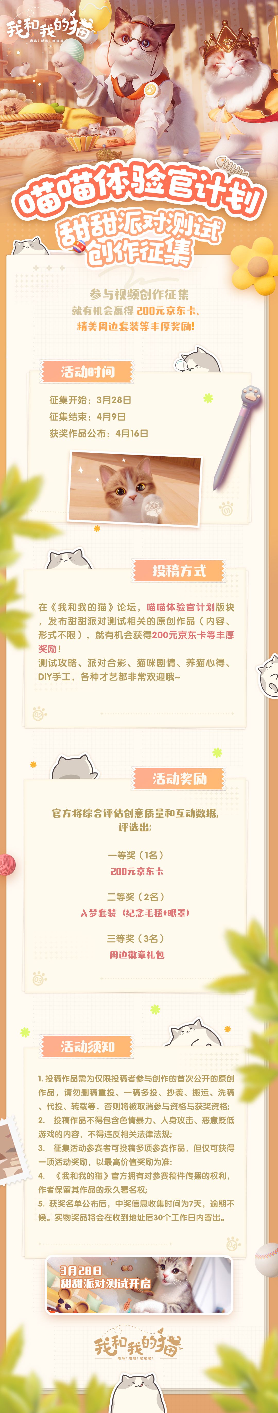 在《我和我的猫》手游专区论坛分享甜甜派对测试中的精彩时刻(内容、形式不限),即有机会获得200元京东卡、精美周边等丰厚奖励!
