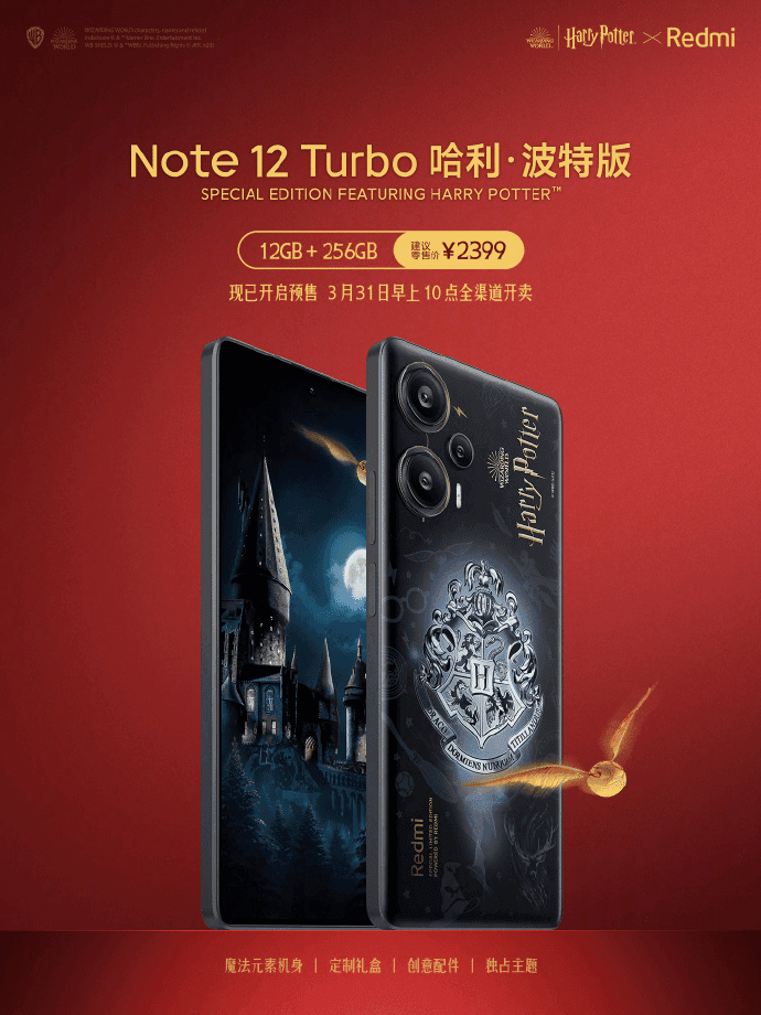 今日,红米公布了全球首款哈利·波特定制手机——Note 12 Turbo哈利·波特版,12GB+256GB售价2399元,3月31日10点开售。