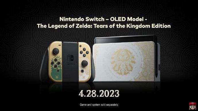 《塞尔达传说:王国之泪》Switch OLED限定机和Pro手柄公开,限定机4月28日发售,手柄和保护包将于5月12日发售。