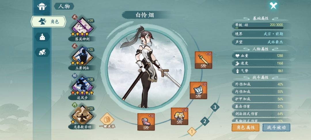 人物成长一共六项,等级,功法,境界,锻体,古玩,装备。