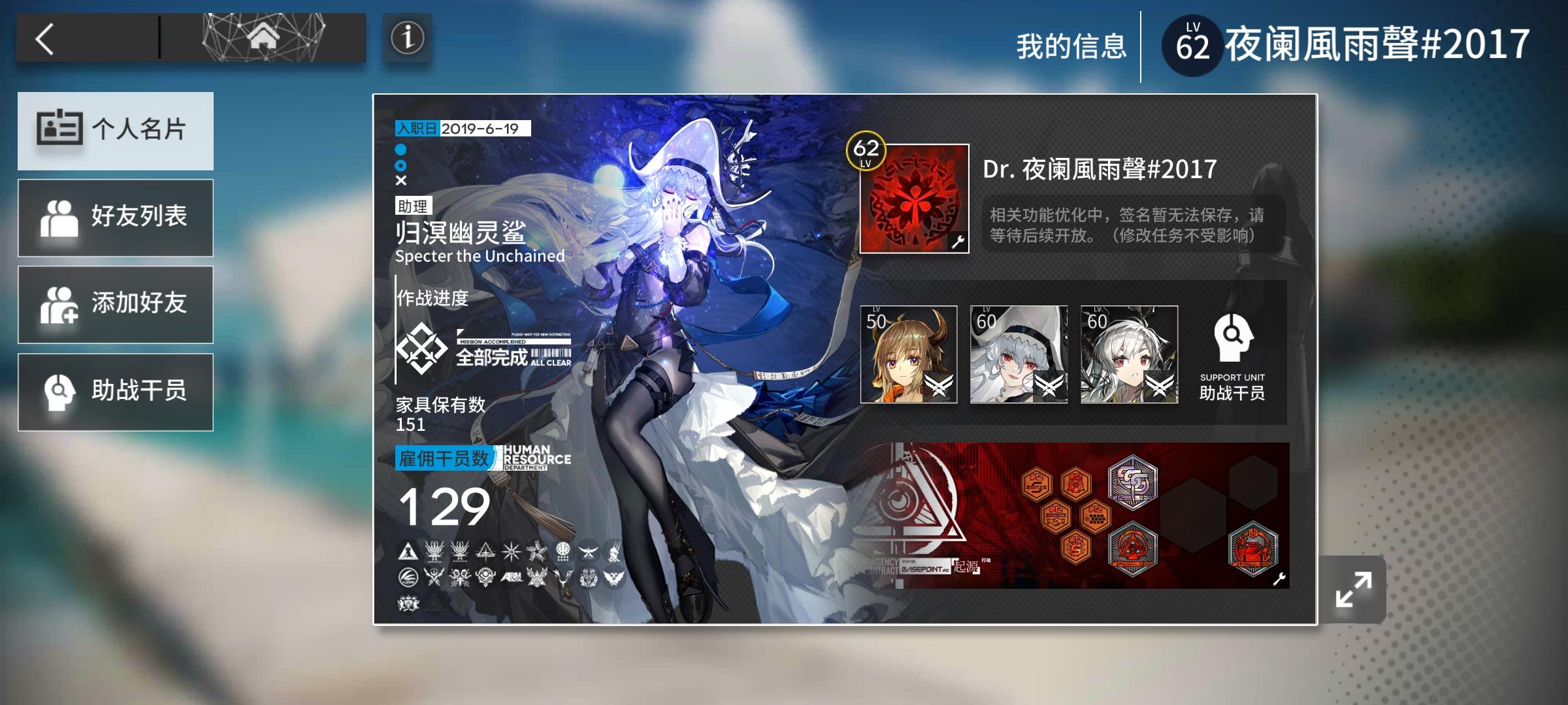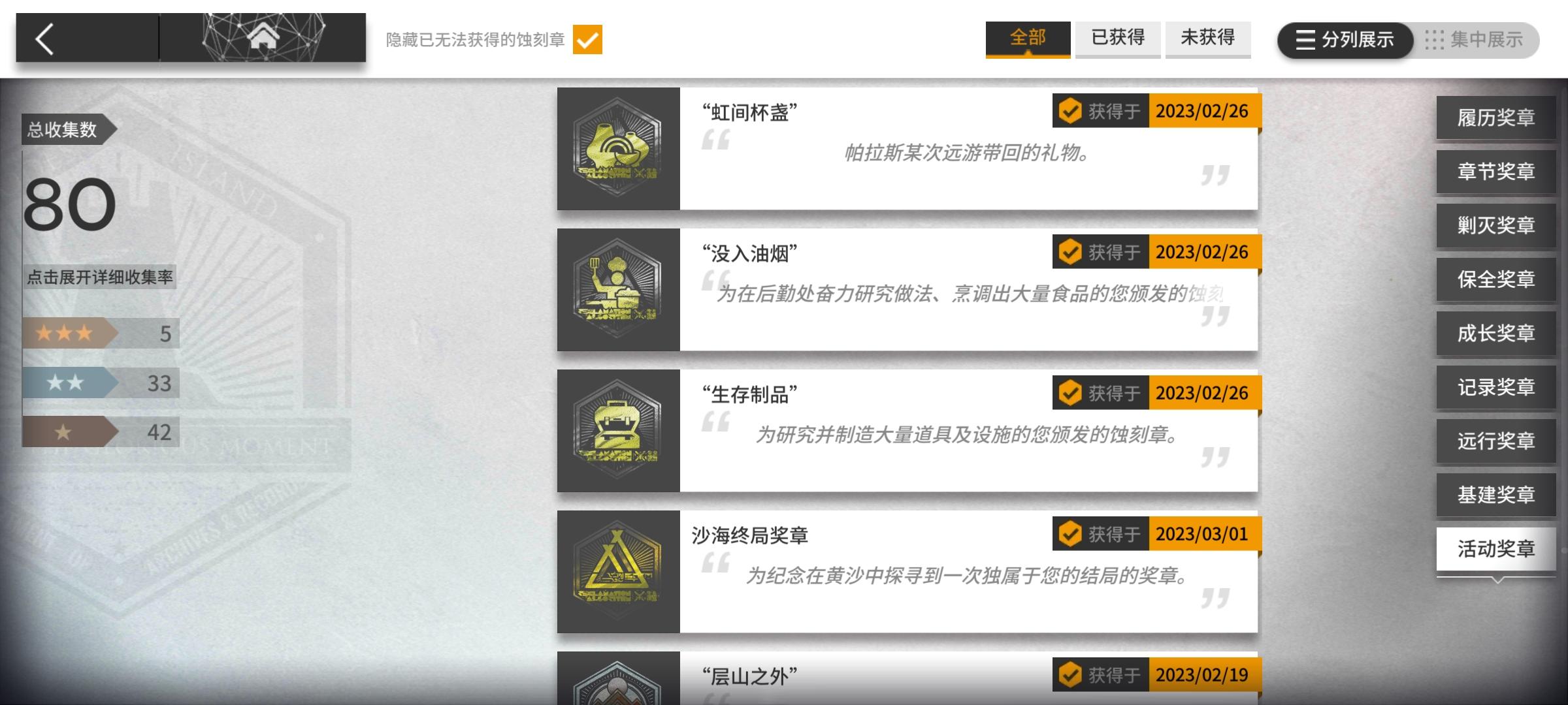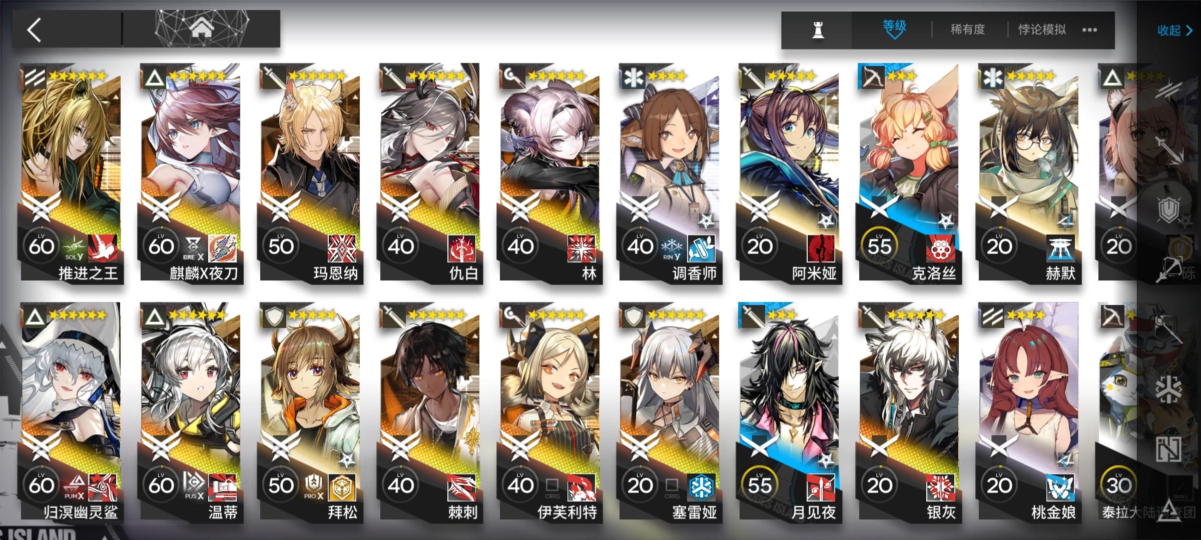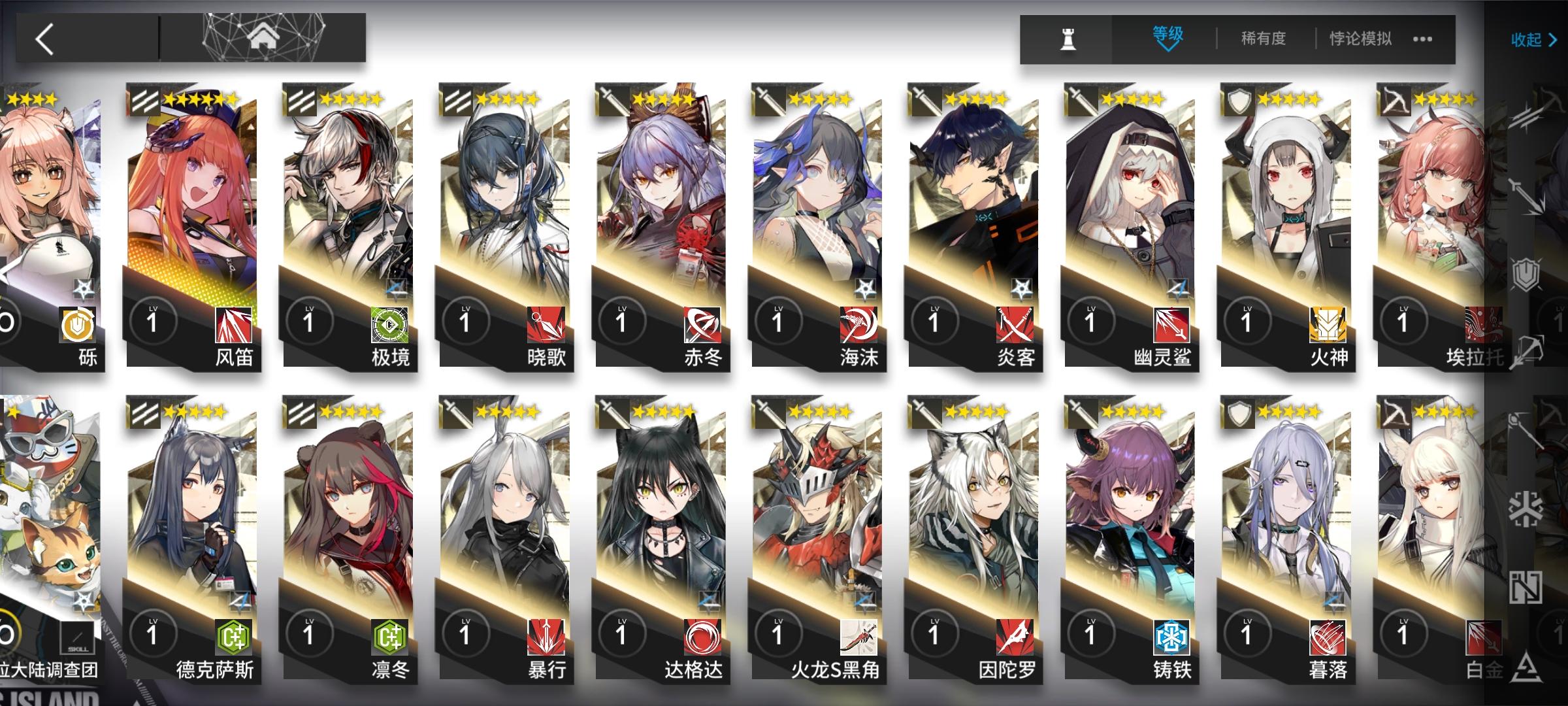月卡党b服6个6星剧情0-2一级开局,除突袭模式和驻守困难外还有几个剿灭还没碰外其余都是全通,包括41天内的复刻活动、春分、生息演算、联动活动都是全通全刻印。