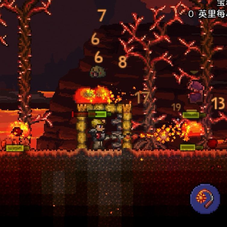 20.在地狱灰烬原左侧或右侧建造居民区,放洞穴晶塔。金虫网捉地狱的小动物后去岩浆钓鱼,可以拿到熔岩护符和过热的血及其他有用的东西。有余力可以整平灰烬原,作为boss战场地(比如美杜莎)。