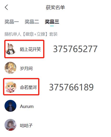 id为:375765277、375766189 的两个账号填写的姓名、电话、地址相同,获得的奖品都是随机单人【立牌+徽章】*1,为了保证公平,也为了让更多大小姐们可以获得周边,我们会给该玩家发送一个随机单人【立牌+徽章】*1,再重新抽选一位大小姐获得随机单人【立牌+徽章】*1。