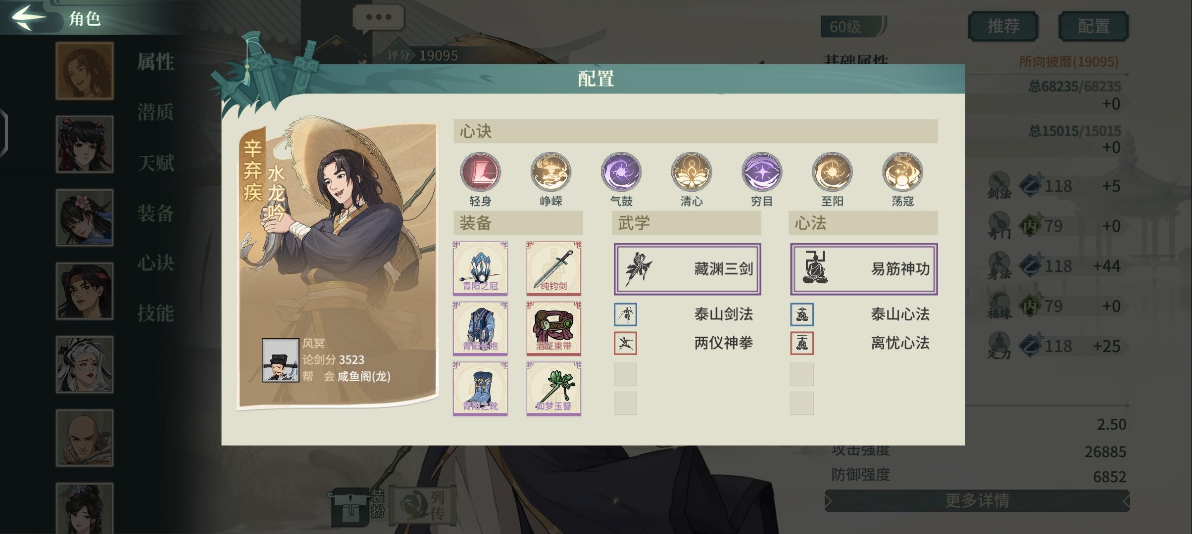 其天赋配合藏渊可以稳定加集气;如果带上如梦佩,可实现全体在20时序一动,后续20或30时序一动,对需要多次出手的侠客帮助很大。上方配置可实现开局5怒气,放出跳劈+易筋(全体天佑),团队性强。