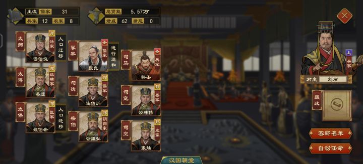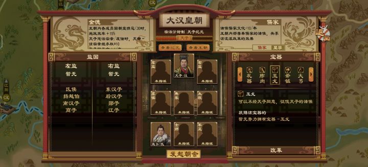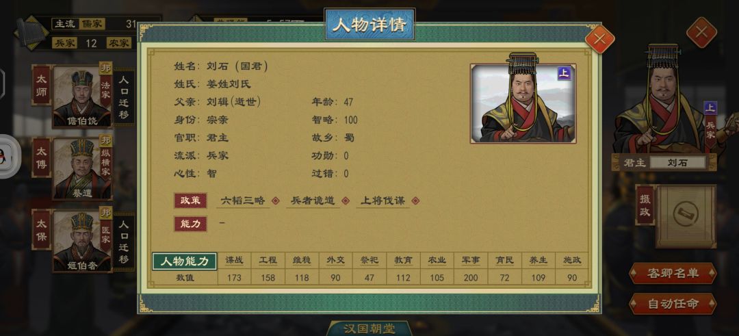 对于王国姓氏不满意的,还可以顺便换国王的姓氏,拿一个你满意的臣子赐婚给他,如果用圣人,最好用新建的圣人可以选你想要的姓,每一个效果都不一样,然后叫什么你也可以决定,最好是农家圣人,他只有挂buff当皇帝不影响,兵家要教兵不厌诈,儒家要辩论,都不方便当。因为我要玩姜姓的效果还有刘氏这个在游戏里少的可怜,如果不想要圣人也可以自己找一个姓氏满意性格满意属性满意的门客放到朝臣里面。