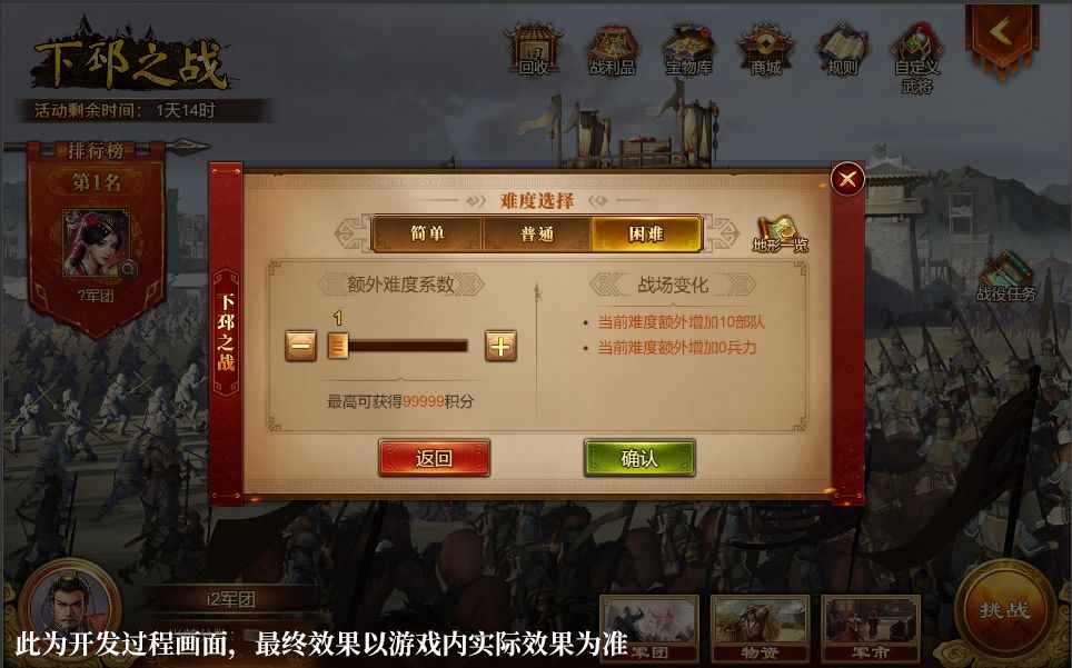 选择右下方【挑战】,即可进行战役难度的选择。我们将增加难度系数的设定,展示不同难度下敌人强化效果,帮助主公大大们评估对手实力,增加游戏竞技性和趣味性。
