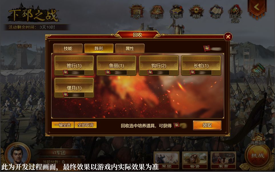 我们收集了不少主公大大们关于战役内资源的意见反馈,并决定以大家的建议为基础,在新版战役中引入全新的功能——“回收”。选择战役界面上方的【回收】选项,就可以选择并回收包括技能、阵形、属性在内的道具,同时获得一定的荣誉奖励。让大家在战役中更加游刃有余,实现资源的最大化利用、战力的最大化提升。