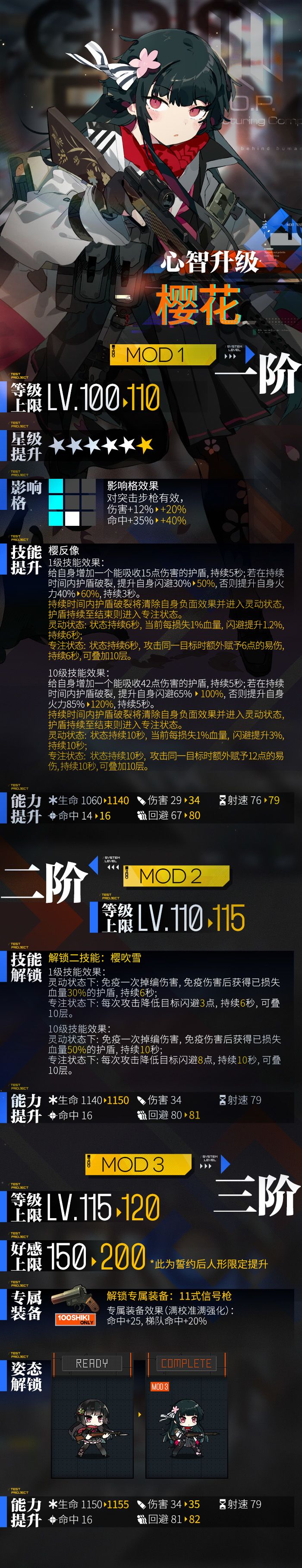 (转发官方动态)亲爱的指挥官们,现在为大家介绍樱花心智升级后的全新姿态,本期心智升级人形将于3月30日维护后登场!在心智升级之后,樱花将成为六星人形!不仅各方面能力得到提升,还将解锁专属装备及全新二技能“樱吹雪”,这也使她的战斗能力进一步增强!