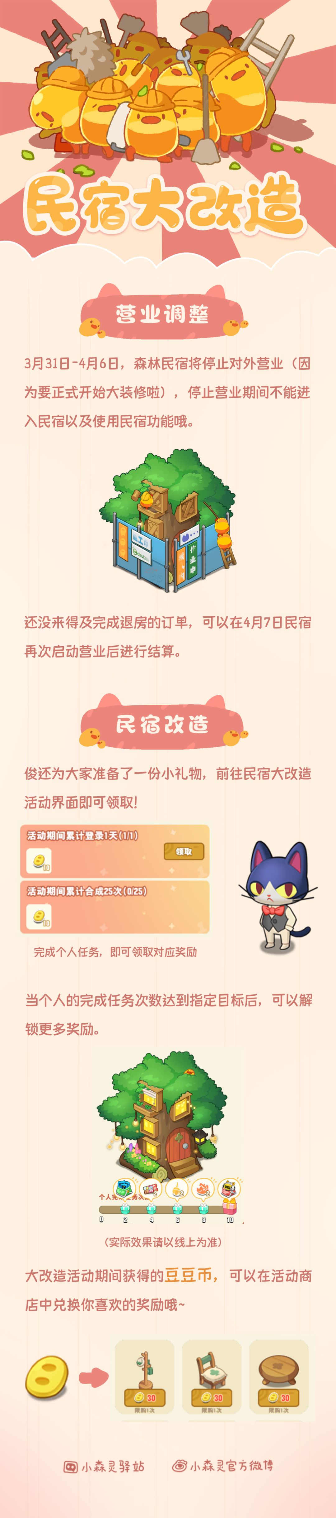 3月31日-4月6日,民宿会暂时停止对外营业1周,在这段时间内完成民宿大改造的系列任务,可以获得豆豆币,前往商店兑换心仪的奖励!