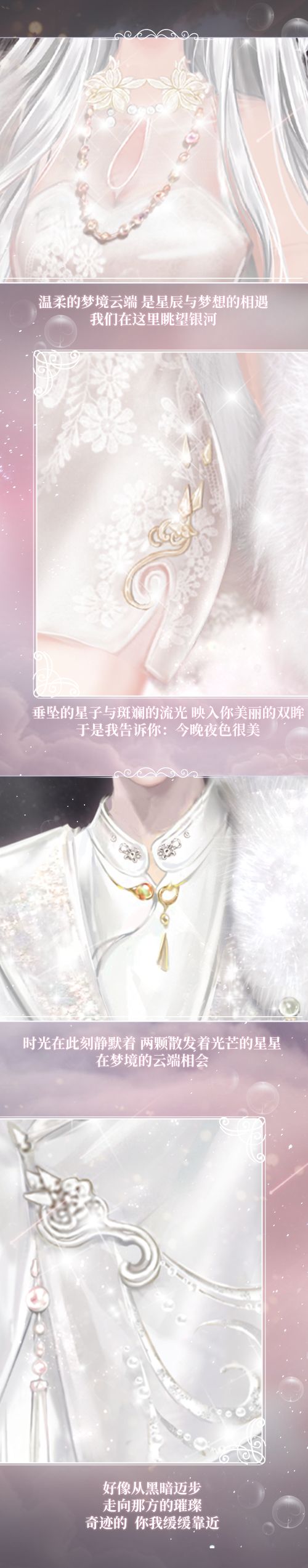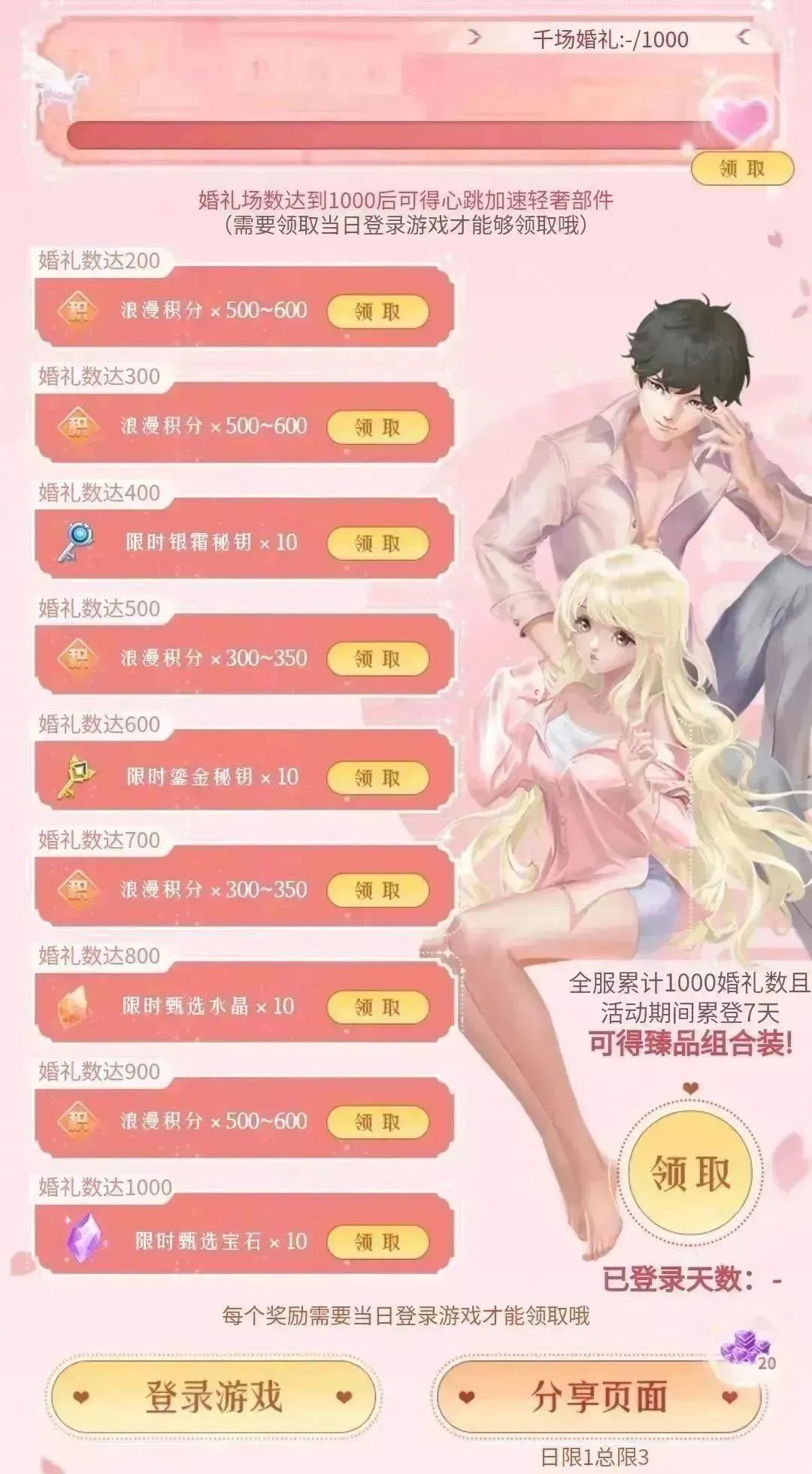 3月25日至4月9日期间,全服累计婚礼数达到1000且期间累登7天可得臻品组合装-迷情夜色,全服累计一定数量的结婚仪式,即可领取浪漫积分、限时抽奖道具等好礼,婚礼场数达到1000后可得心跳加速轻奢部件(所有奖励必须领取当日登录游戏才能够进行领取),分享页面可获得20钻石的额外奖励;此外,玩家可在页面选择自己的好友并表白,成功分享表白还可以获得极光抽奖礼包*5的对应奖励(选择好友时,展示的游戏好友列表为活动开启2周前玩家的好友列表,可能会与现好友列表有一定偏差)。