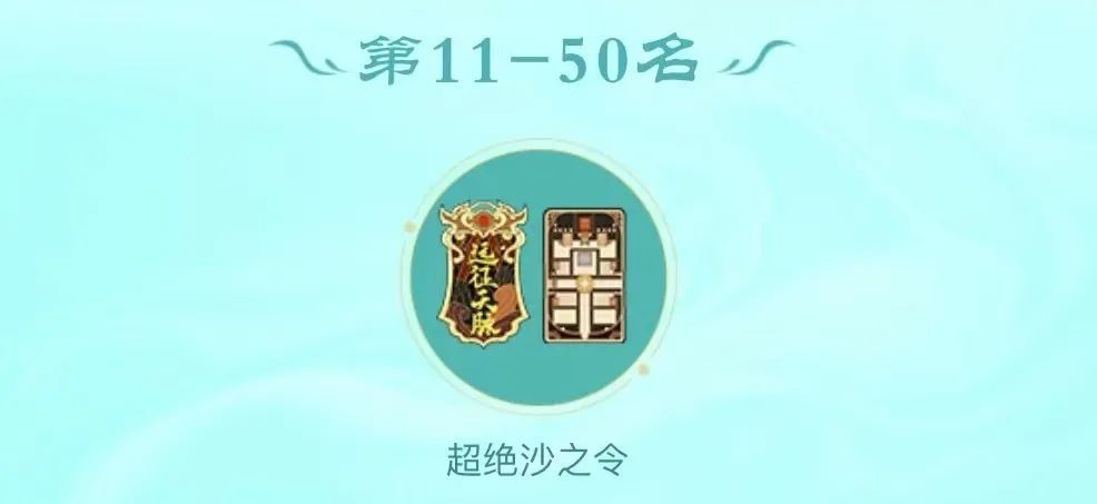 第1名:专属称号·西域远征先锋(60天)、【纪念实物徽章·极品沙之令】、【超绝·沙之令】、10000任选箱*5、和氏璧(封)*5;