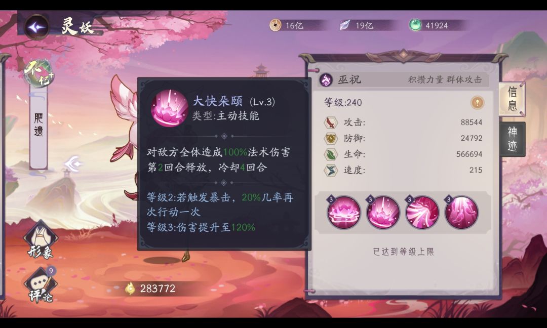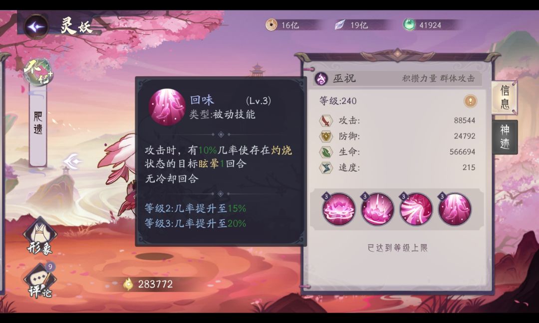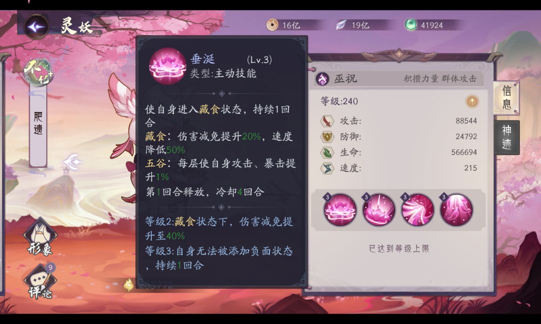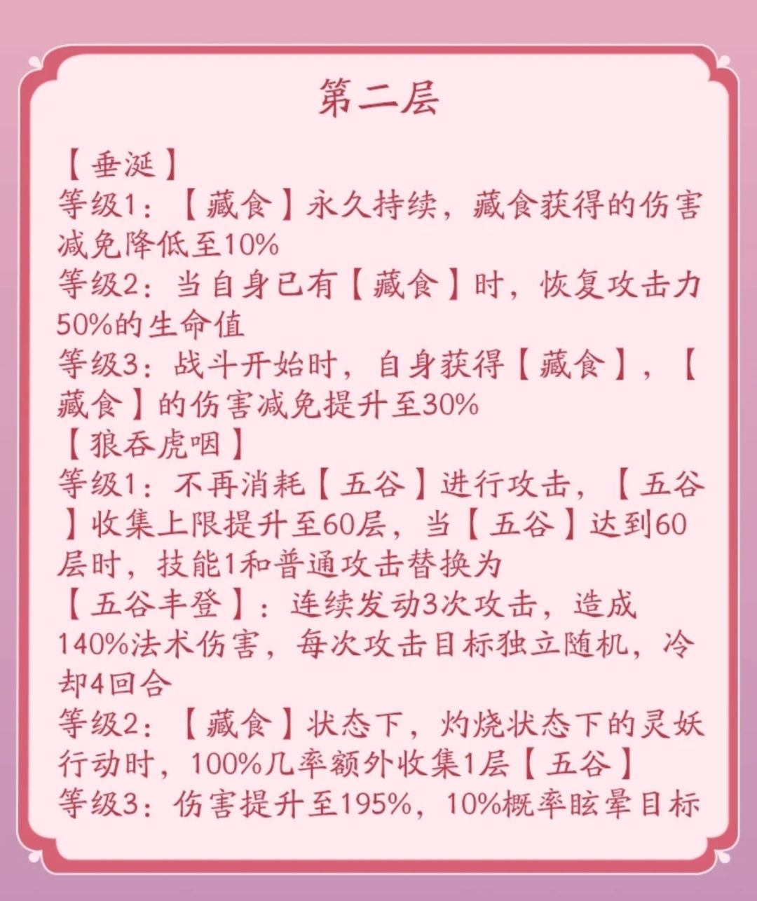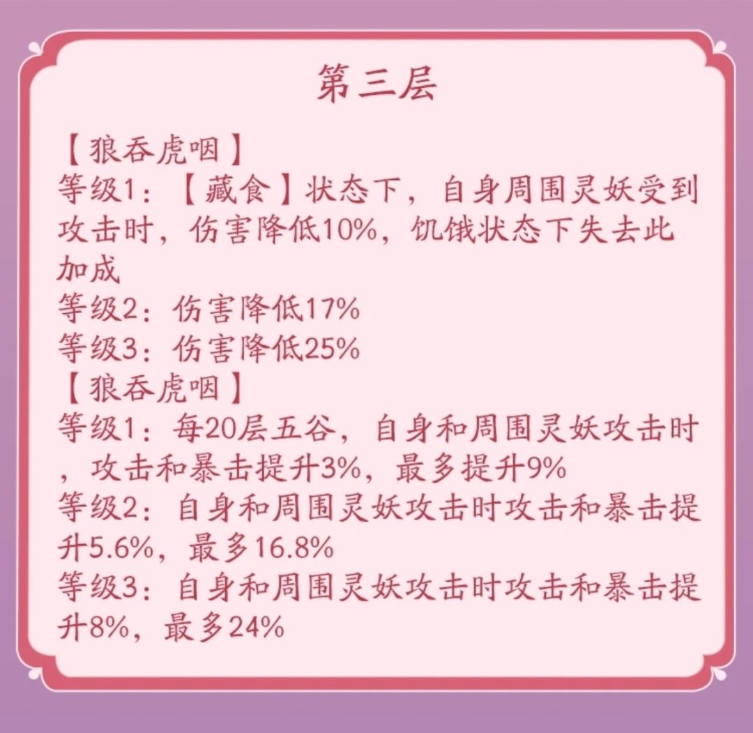 被动技能:〖狼吞虎咽〗五谷是肥遗的核心技能,提升自身暴击、攻击的同时达到指定层数后会产生额外收益。在技能机制上类似的灵妖还有羲和、仓颉,参考这两位灵妖的强度,肥遗的战斗力可见一斑。〖回味〗群控技能
