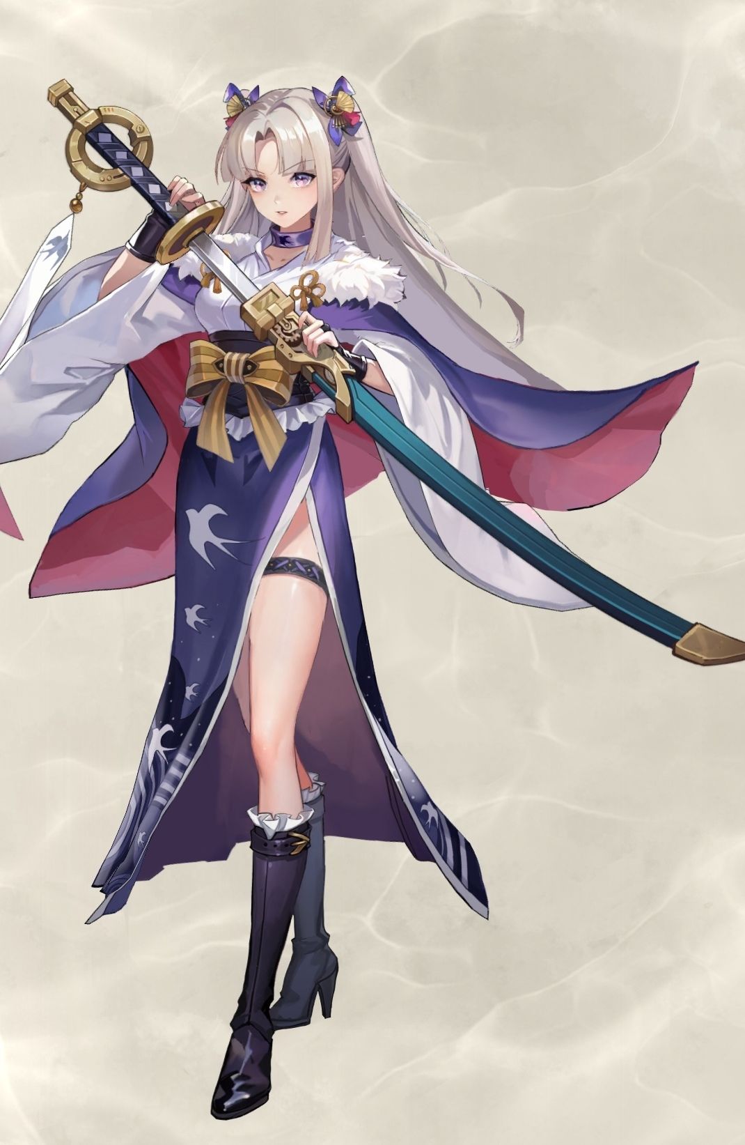 月咏发型打破了剑道少女传统的高马尾,服饰上有很多燕子的元素,对应她的技能“燕返”,然后武器是一把三尺长刀“物干焯”,穿着离经叛道的高跟靴子,可以在近身战用鞋跟对对手造成大量伤害![[嗒啦啦4_坏笑]](https://img-tc.tapimg.com/market/images/644c03a7456ff71d7b6b6a919b2d8817.gif)